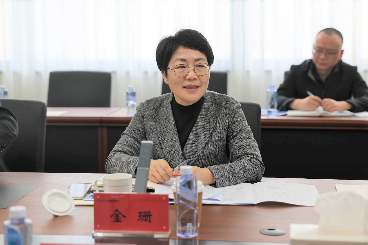 在宁波通商集团,金珊听取通商集团党委书记、董事长宋达军关于通商组建以来取得的主要成绩和下一步工作的汇报。